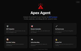 Apex Agent to bezpłatny dodatek do przeglądarki Chrome, który umożliwia integrację asystentów AI z przeglądarką za pomocą protokołu Model Context Protocol (MCP). Dzięki wszechstronnej funkcjonalności, użytkownicy mogą automatyzować różne zadania w przeglądarkach, korzystając z ponad 69 narzędzi do nawigacji, interakcji oraz analizy stron internetowych. Narzędzie wspiera wiele kompatybilnych asystentów AI oraz oferuje wbudowany panel do używania własnych kluczy API, co czyni je elastycznym rozwiązaniem dla programistów i testerów.